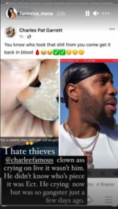 “I hate thieves,” Mena wrote. “@charleefamous clown ass crying on live it wasn’t him,” she wrote. “He didn’t know who’s piece it was…He crying now but was gangster just a few days ago.”