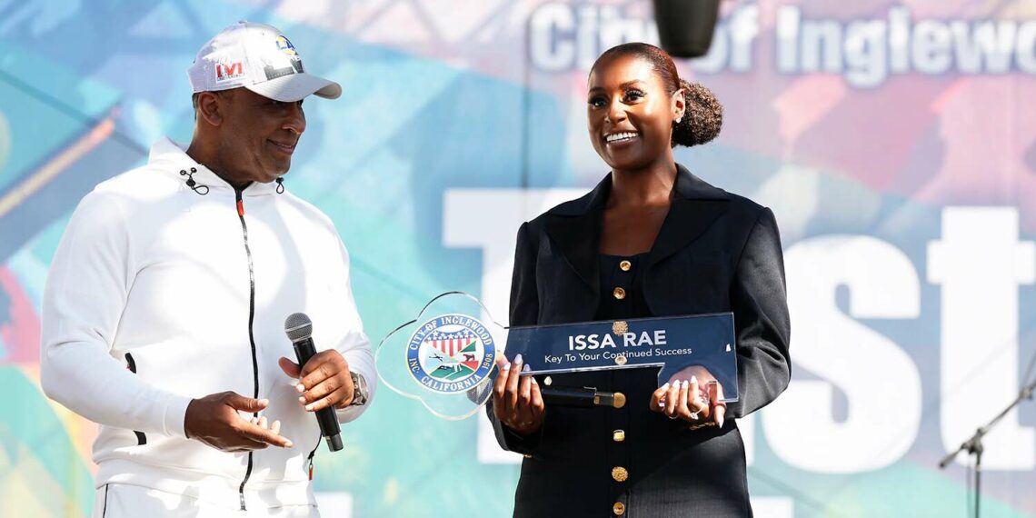 In Inglewood this afternoon, 24 hours before Super Bowl kickoff at SoFi across the street, as Issa Rae is given the key to the city. It’s the first one given in Inglewood’s 100+ year history pic.twitter.com/AXAVD6RnTl