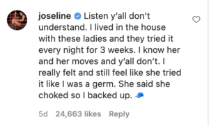 “Listen, y’all don’t understand,” Joseline said. “I lived in the house with these ladies, and they tried it every night for 3 weeks. I know her and her moves, and y’all don’t. I really felt and still feel like she tried it like I was a germ. She said she choked, so I backed up.”