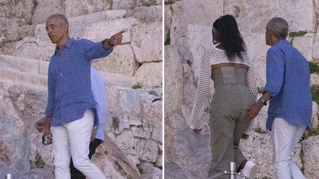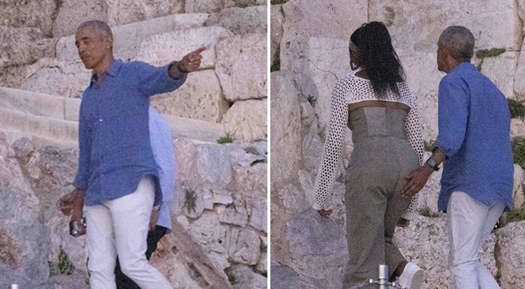 As the family ascended stairs while checking out the Acropolis in Athens, Barack couldn’t help but lend Michelle a helping left hand on her rump while their daughters — Malia, 24, and Sasha, 21 — trailed.